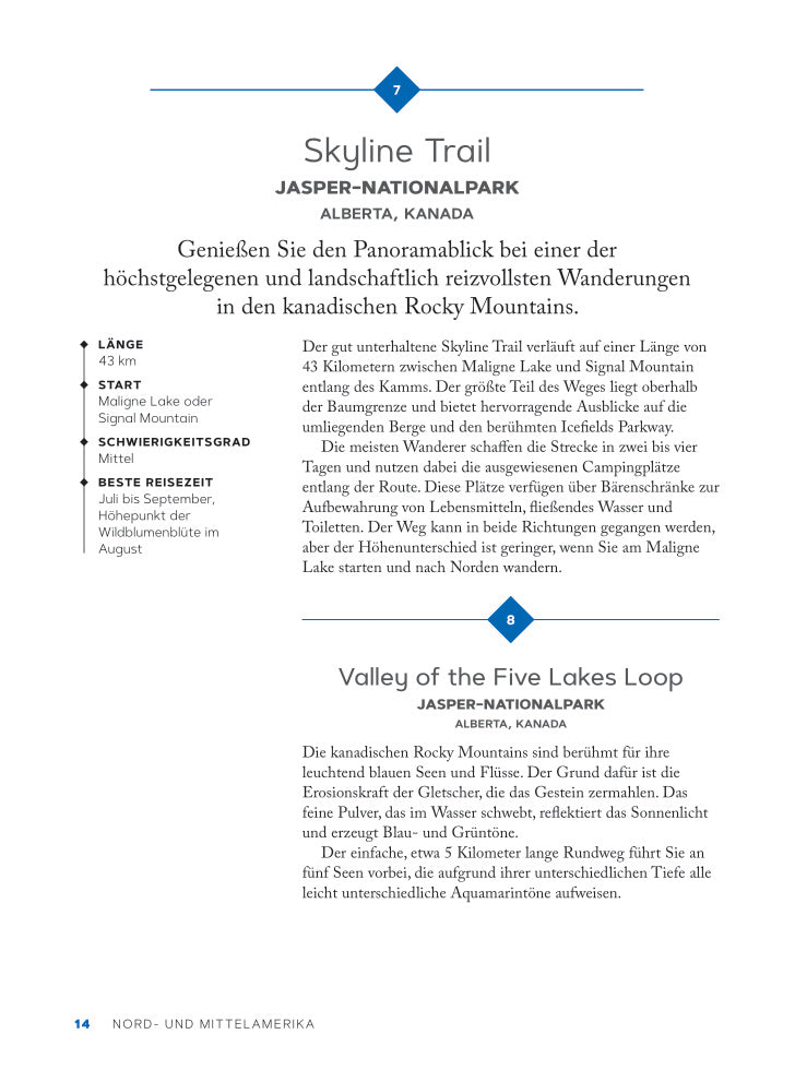 Die vorgestellten Wanderungen und Trails variieren zwischen einfachen kurzen Spaziergängen, halbtägigen Wanderungen und herausfordernden mehrtägigen Touren in unterschiedlichsten Terrains. Geordnet nach Kontinenten und Nationalpark wird jede Route kurz und kompakt vorgestellt. Auf doppelseitig vorgestellten Touren ist die Streckenlänge angegeben und Kartenskizzen vermitteln einen ersten Eindruck vom Verlauf der Wanderung. Mit Tipps zur Navigation, Ausflugsplanung und Tierbegegnungen ist man bestens gerüstet, um die Wanderlust zu stillen.