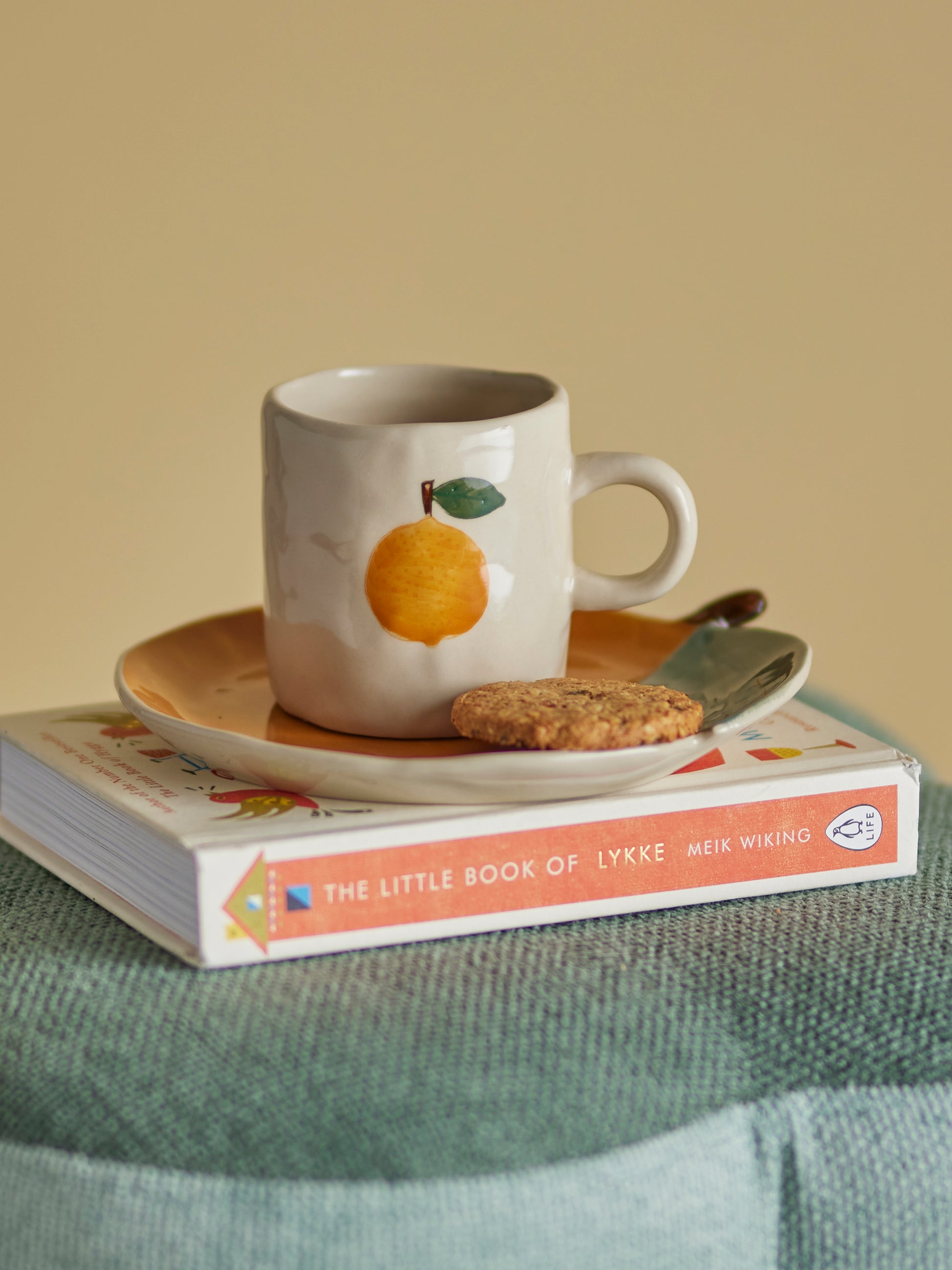 Die Agnes | Kindertasse aus Steingut von Bloomingville MINI ist klein, handgefertigt und voller Charme. Jede Tasse trägt ein fruchtiges Detail, das den Alltag versüßt: Eine kleine Überraschung wartet am Boden – und zaubert garantiert ein Lächeln beim Trinken.