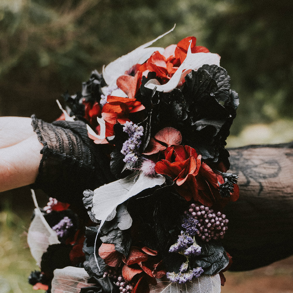 Feder & Konfetti steht für Trockenblumenkunst, die mit Liebe & Leidenschaft von Hand in unserer Produktion im Erzgebirge angefertigt wird – in dieser Edition inspiriert vom dunklen Charme des Wednesday Addams Looks.