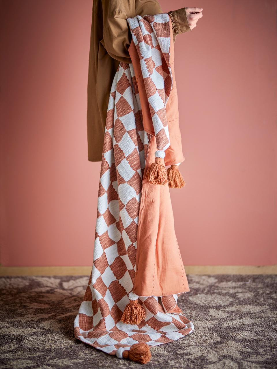 Die Decke Chola von Creative Collection ist aus recycelter Baumwolle (OEKO-TEX®) gefertigt und zeigt ein grafisches Karomuster in Braun und Weiß. Jede Ecke ist mit Quasten versehen, die für ein verspieltes Element sorgen.