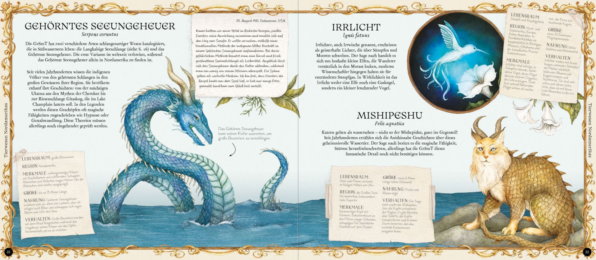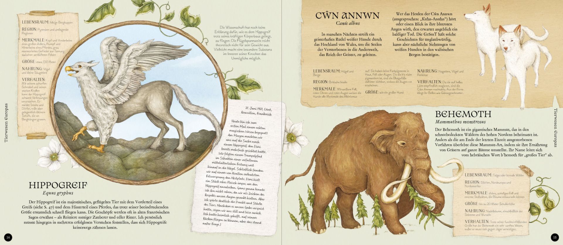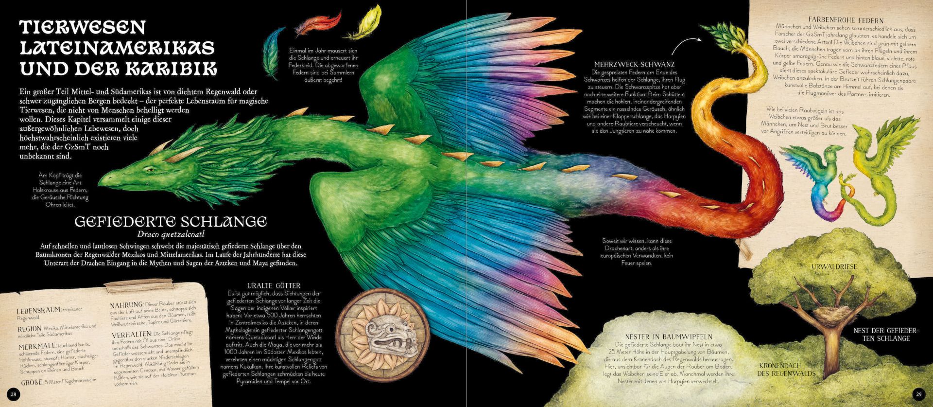 Mit prachtvoll gestalteten Illustrationen begegnen wir bizarren und wunderschönen Kreaturen aus aller Welt. Auf 64 Seiten erfahren wir mehr über ihre Gewohnheiten, Lebensräume und die Legenden, die sich um sie ranken. Die Anatomie eines Einhorns, der Lebenszyklus eines Phönix, die atemberaubenden Balztänze der Drachen – all das und noch viel mehr warten in diesem ultimativen Leitfaden auf magische Entdeckungen.