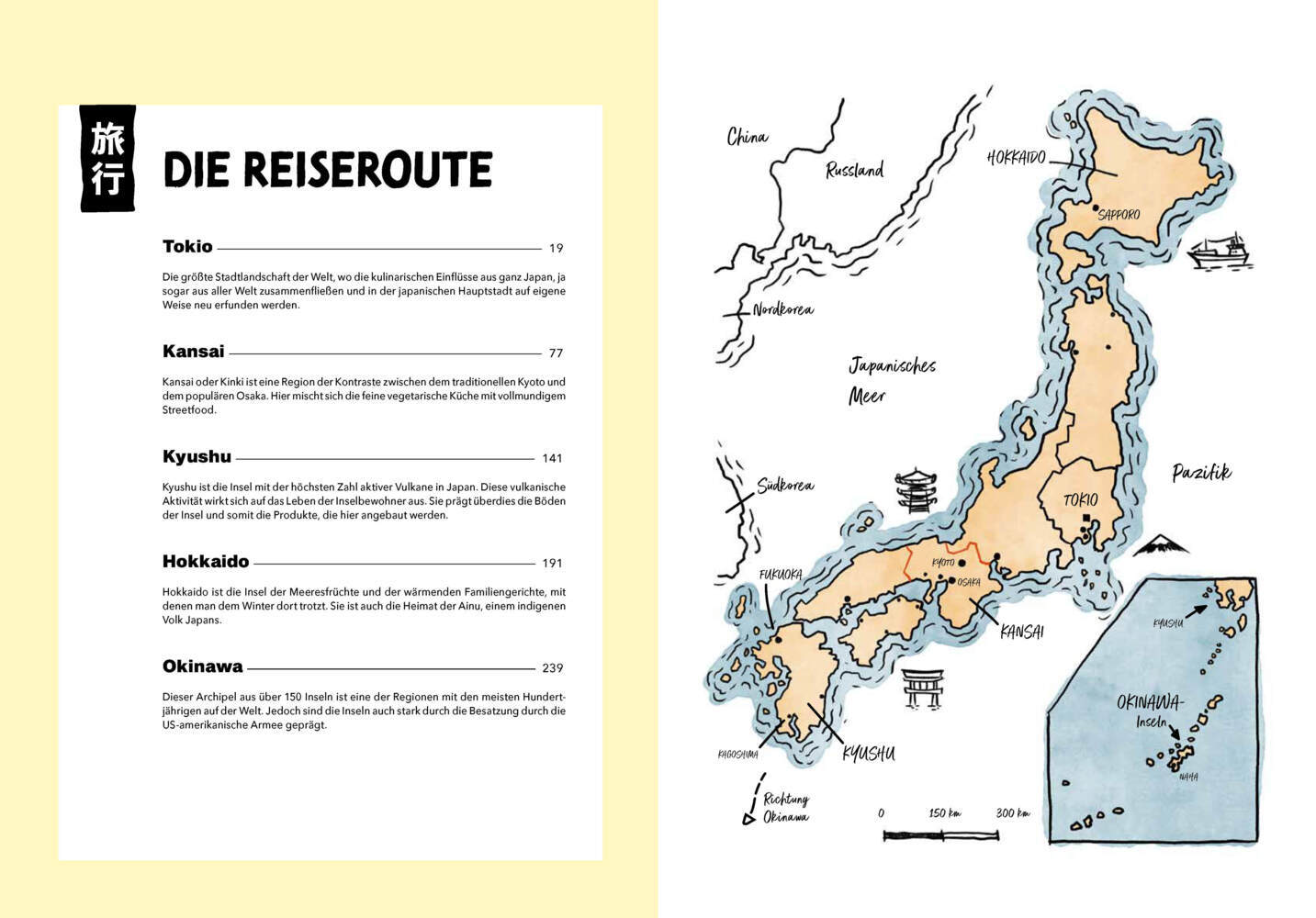 Die Reise führt dich von Tokio über Kansai, Kyushu und Hokkaido bis nach Okinawa und beleuchtet die unterschiedlichen regionalen Küchen und ihre besonderen Merkmale. 30 Beiträge rund um das Thema „Essen“ bieten interessante Einblicke und geben Anregungen für zukünftige Reisen. Stimmungsvolle Fotos und ausdrucksstarke Strichzeichnungen begleiten die Reise und bereichern das Buch um charmante Food-Illustrationen.