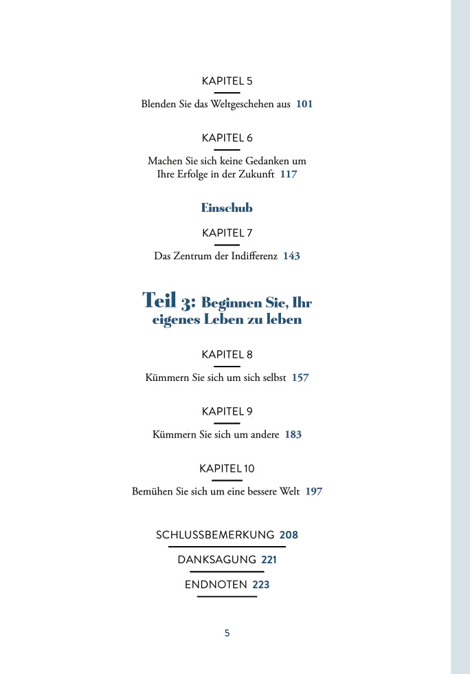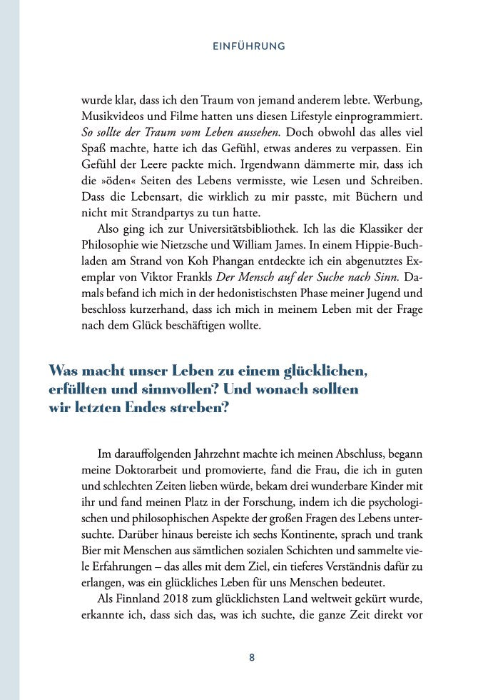 Mit einer einzigartigen Mischung aus persönlichen Geschichten, unterhaltsamen Anekdoten aus dem Alltag des glücklichsten Landes der Welt und neuesten wissenschaftlichen Erkenntnissen bietet Martela einen frischen Ansatz, das Leben zu genießen. Mit vielen hilfreichen Tipps und praktischen Impulsen führt der Ratgeber anschaulich durch einen persönlichen Entwicklungsprozess: Vom Ablegen hinderlicher Ego- und Erfolgserwartungen, über das Erlernen von Akzeptanz, bis hin zu einer neuen, sinnorientierten Lebensführung. Statt Glück zwanghaft zu jagen, lernen wir, im Hier und Jetzt zufrieden zu leben und ein erfüllteres Leben zu führen.
