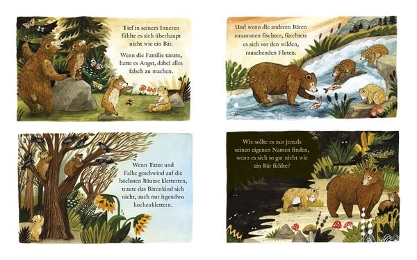 Ein kleiner Bär spürt tief in sich, dass er anders ist – und genau das macht seine Geschichte so berührend. Während seine Geschwister flink auf Bäume klettern und ohne Angst im Wildwasser fischen, zögert das Bärenkind und fühlt sich nicht wie ein „echter Bär“. Zweifel und Unsicherheit begleiten es… bis eines Nachts ein wundervoller Feuervogel erscheint.