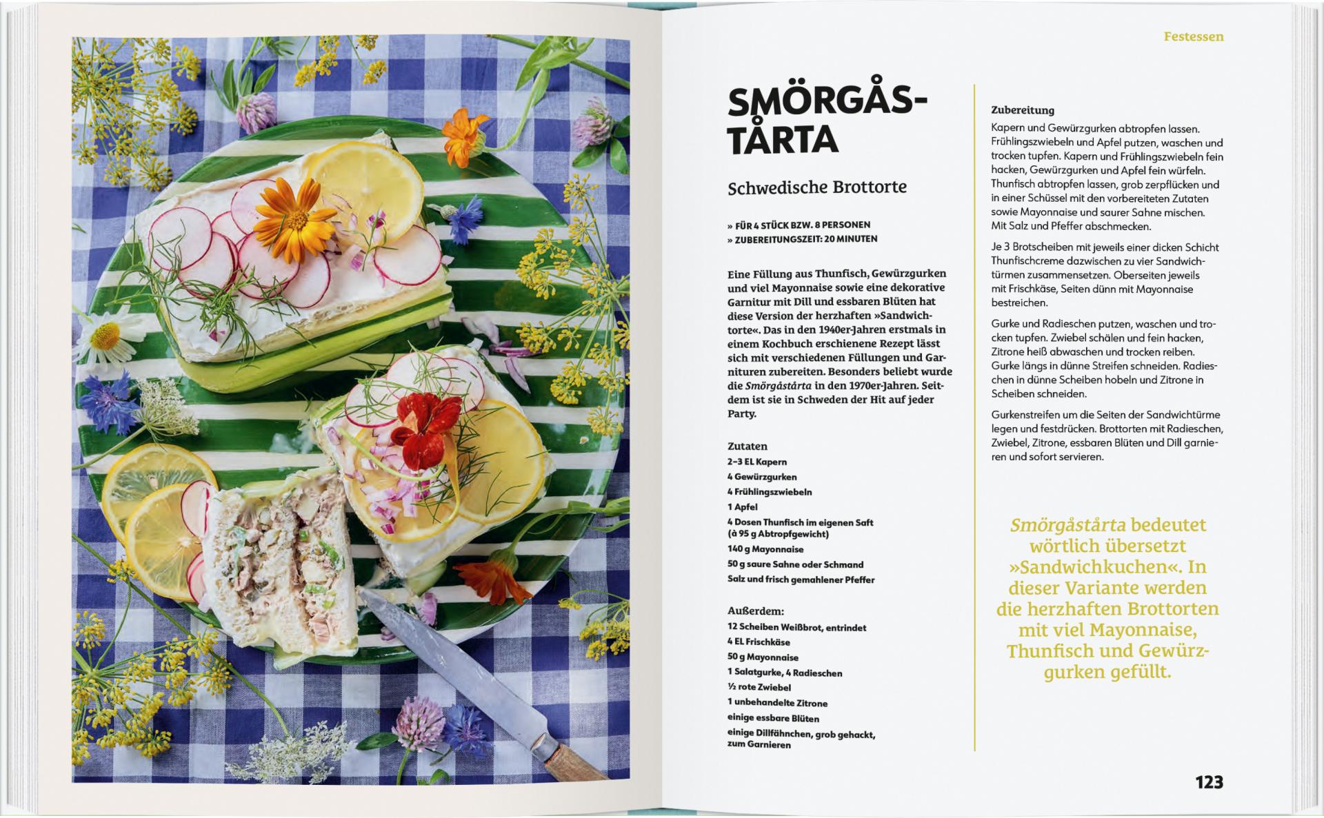 Smörgåsbord bedeutet wörtlich „Brot- und Buttertisch“, an diesem genießt man gemeinsam Hering, Räucherlachs, Roastbeef, mit Krabben gefüllte Eier, gekochte Kartoffeln und natürlich Köttbullar, Hackbällchen. Das dazu gereichte Knäcke- und Roggenbrot ist natürlich selbst gemacht! An Feiertagen kredenzt man Langustensuppe, Schinkenbraten, Mittsommerbeerentorte, Safranbrötchen und selbst gemachten Glühwein. Eine wichtige soziale Institution ist Fika, Kaffeetrinken in geselliger Runde, da dürfen Zimtschnecken, Mandelkekse und Schonischer Apfelkuchen nicht fehlen, um nur einige der zahllosen süßen Leckereien zu nennen. Im letzten Kapitel werden Rezepte für Brote, Saucen und Getränke präsentiert. Dieses Buch lässt die Herzen aller Schweden-Liebhaber höher schlagen!