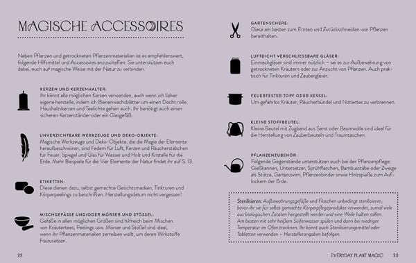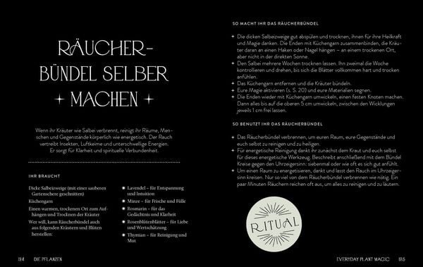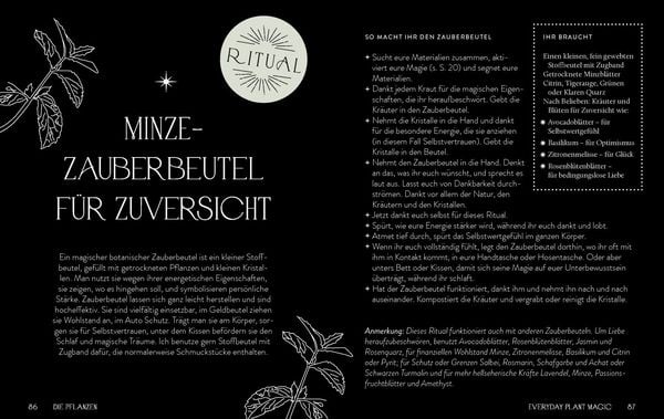 Manche der im Buch vorgestellten Pflanzen sind von heilendem Charakter, andere stimulieren, reinigen oder energetisieren. Wieder andere können helfen, den Geist zu beruhigen oder den Körper zu vitalisieren. So kannst du beispielsweise Bogenhanf neben die Tür stellen, um schlechte Energie abzuwehren, Aloe-Vera-Blätter zur Heilung von Verbrennungen verwenden oder einen Rosenquarz ins Rosenbeet geben, um Liebe anzuziehen. Dieser praktischen Leitfaden gibt Dir alles Wissenswerte an die Hand, um mithilfe von Ritualen, Tinkturen und Zaubersprüchen die magischen Eigenschaften von Pflanzen zu nutzen und verrät Dir sogar, wie du die Energie beispielsweise mit Edelsteinen noch verstärken kannst.