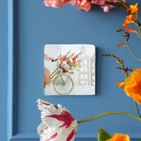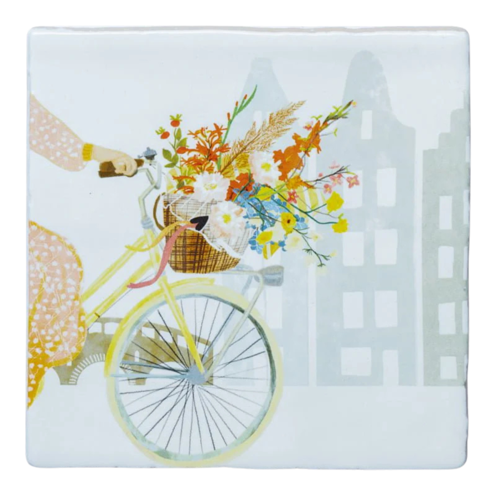 Die Glück im Fahrradkorb | Dekofliese StoryTiles bringt Leichtigkeit und Freude ins Zuhause – ein kleines Kunstwerk, das das Glück direkt im Fahrradkorb vorbeiradeln lässt, mit Blumen in all deinen Lieblingsfarben. Sie erinnert daran, wie schön es ist, wenn jemand unterwegs zu uns ist – leicht, fröhlich und voller Leben.