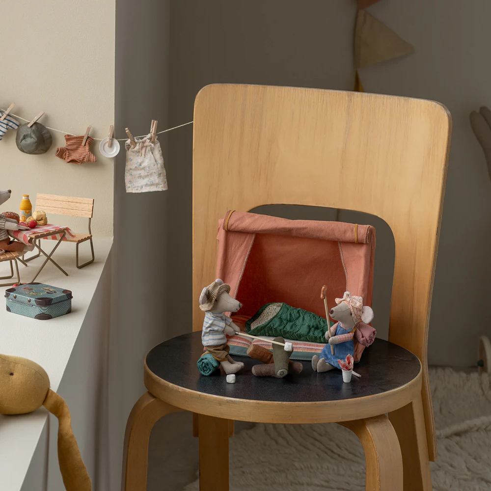 Ob als Erweiterung für die Maileg-Welt, als Bühne für Geschichten oder als Geschenkidee für kleine Abenteurer*innen – dieses Zelt schafft Raum für Fantasie, Freundschaft und kleine Auszeiten. Vergiss die Schlafsäcke nicht – die Reise kann beginnen!