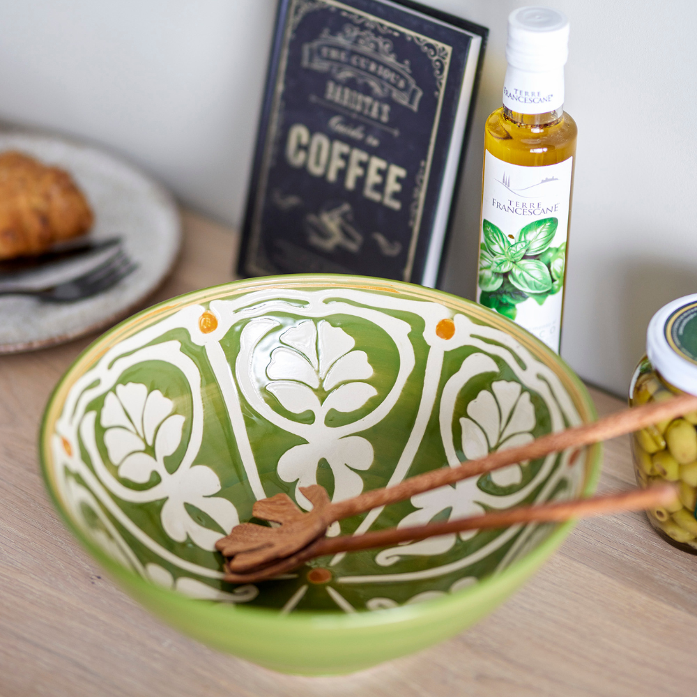 Grün – große Schale (Ø 26,5 cm) mit handgemaltem Muster in hellen und grünen Nuancen, perfekt für Salate, Obst oder dekorative Arrangements. Fassungsvermögen: 2.580 ml.