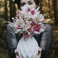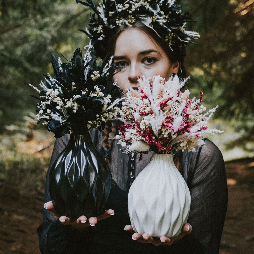 Lass Dich von Light & Shadow verzaubern – zwei Vasen mit handgebundenem Strauß, die ohne Wasser auskommen, aber die Magie von Hell und Dunkel in dein Zuhause bringen.