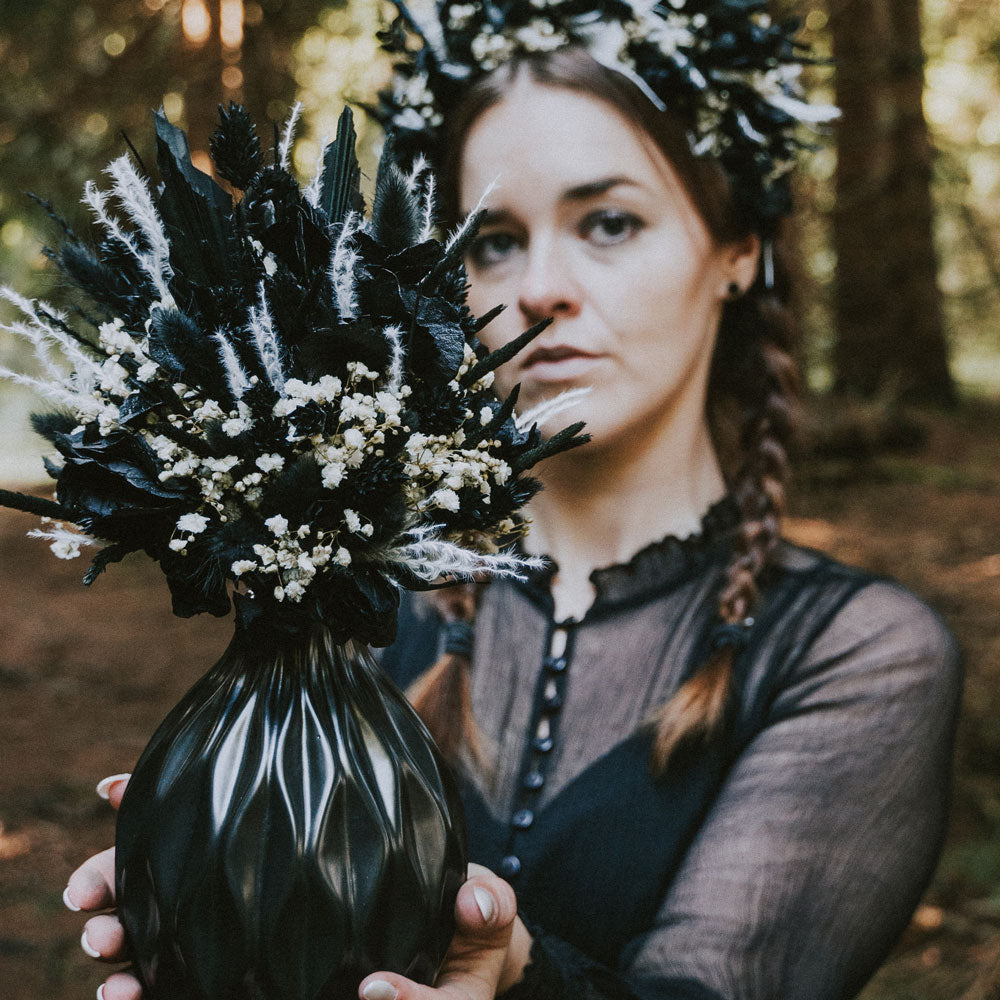 Feder & Konfetti steht für Trockenblumenkunst, die mit Liebe & Leidenschaft von Hand in unserer Produktion im Erzgebirge angefertigt wird – in dieser Edition inspiriert vom dunklen Charme des Wednesday Addams Looks.
