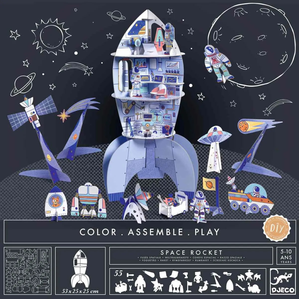 Ein Kreativset zum Erstellen einer vollständig eingerichteten Rakete mit Accessoires, um den Weltraum zu erkunden! Eine Rakete über drei Etagen und mehr als 55 Möbel und Accessoires (Roboter, Satellit, Tablets usw.) zum Ausmalen und dann Zusammenbauen. Das kreative Vergnügen des Ausmalens in Kombination mit dem Bauen von Gegenständen mit Volumen. Für ein stundenlanges Bauen und Freude am Spiel! Maße des fertigen Produkts: 53 x 25 x 25 cm. Für Figuren mit einer Höhe von +/- 8 cm geeignet.