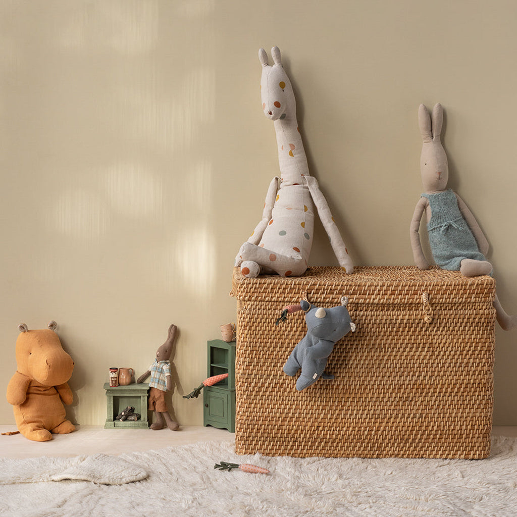 Erhältlich in verschiedenen sanften Farben – von zarten Rosétönen über Blaugrau bis zu warmem Honig oder Cremegelb – passt dieser Safari-Freund wunderbar in jede Spielwelt und bringt Wärme und Geborgenheit ins Kinderzimmer.