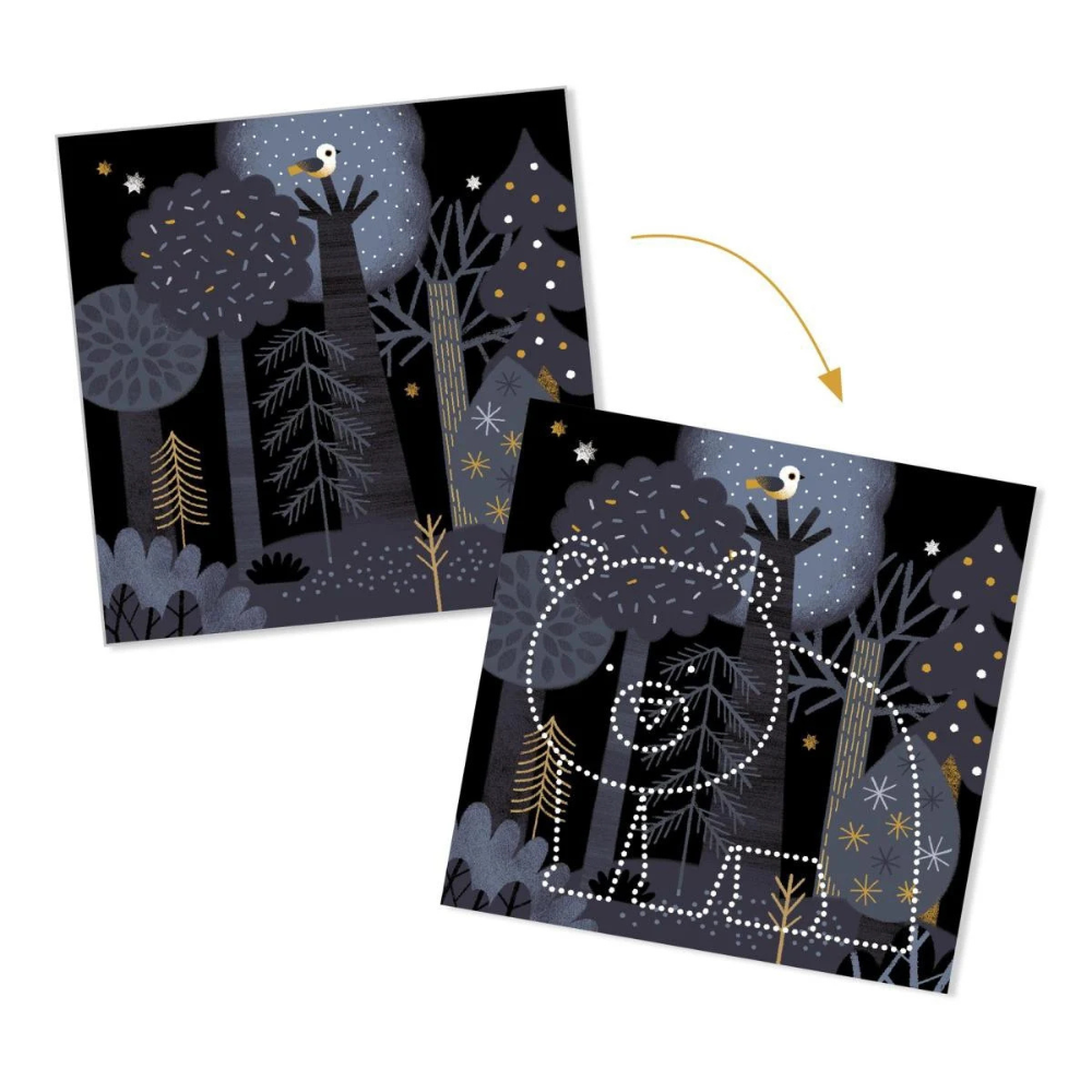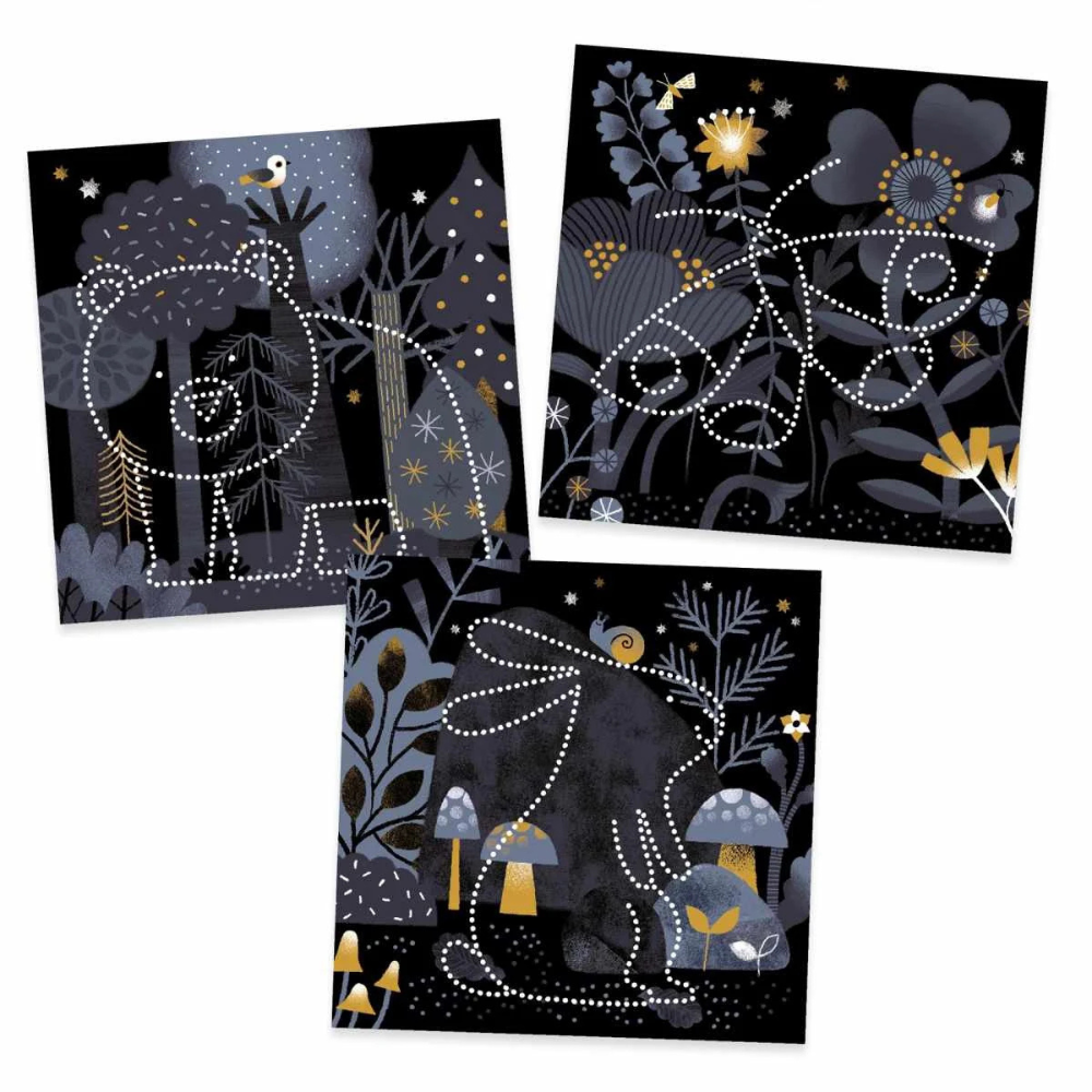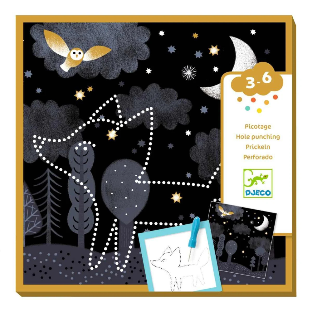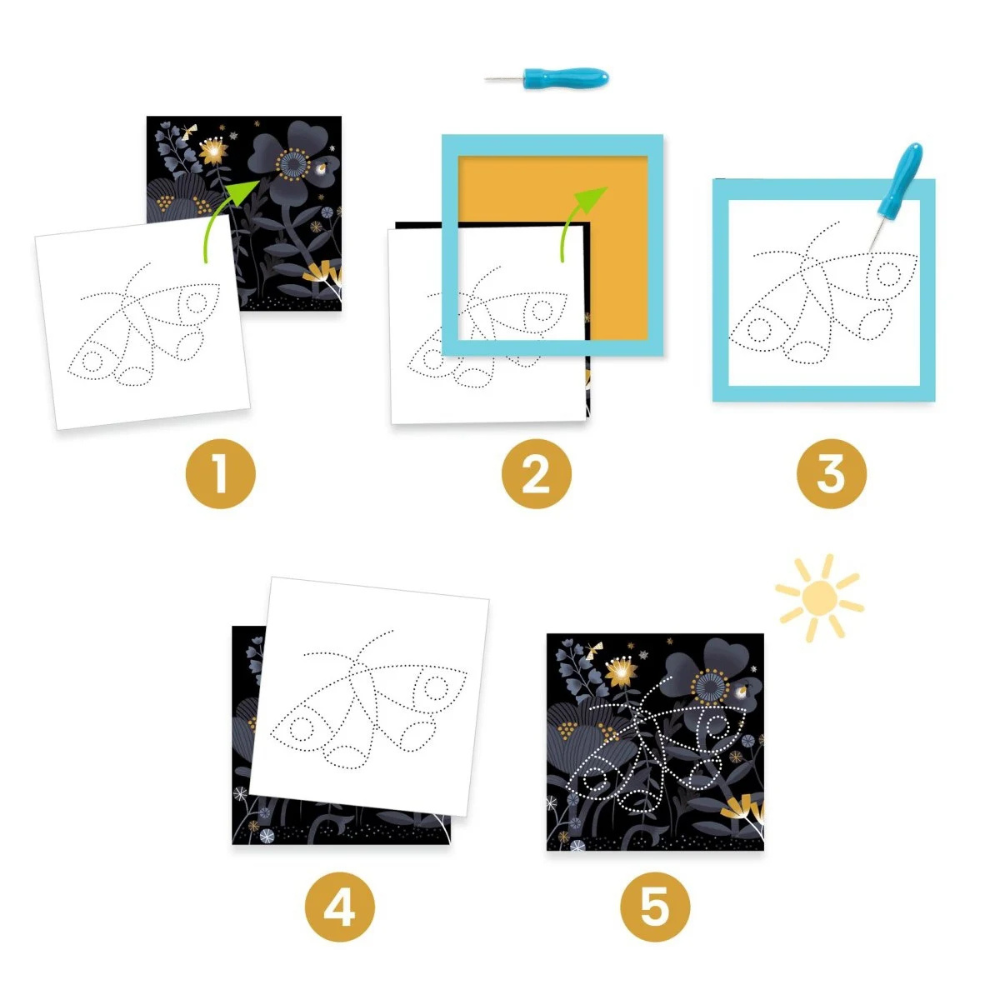 Punkt für Punkt zum Tierbild. Mit dem Prickeln | Kreativset von Djeco entdecken Kinder ab 3 Jahren eine kreative Technik, die Geduld, Geschick und Konzentration spielerisch fördert. Ganz ohne Text, aber mit klaren Bildern zeigt das Set, wie durch gezieltes Prickeln kleine Kunstwerke mit versteckten Tieren entstehen – die später sogar leuchten, wenn man eine Lichtquelle dahinterstellt.