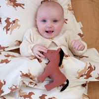 Die Fabelab Rassel ist weich und wattiert, und wenn das Kind sie schüttelt, klappert sie.