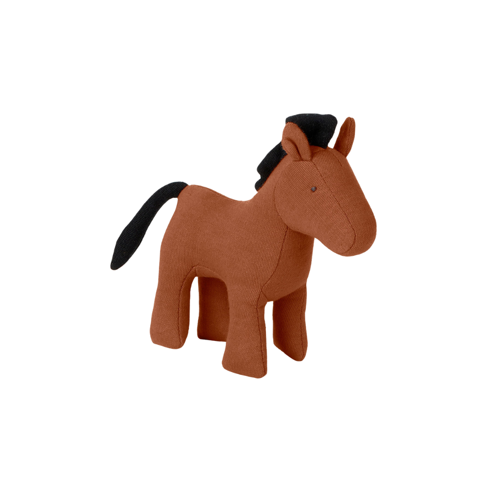 Niedliche Rassel HECTOR in Form eines braunen Pferdes mit schwarzer Mähne und Schweif.