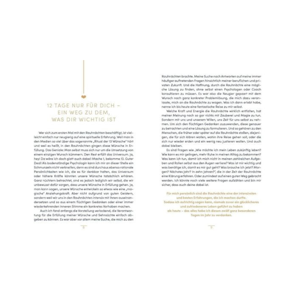 Kurz und kompakt und trotzdem mit Tiefgang leitet das Buch durch alle zwölf Tage und Themenbereiche der Rauhnächte. Nach einem kurzen Überblick über die Traditionen und Ursprünge der Rauhnächte sowie Tipps und Tricks zur Vorbereitung der stillen Zeit geht es direkt los. Jede Rauhnacht steht unter einem bestimmten Motto und beginnt mit einer inspirierenden Geschichte. Anschließend werden, passend zum Tagesmotto, ein Tagesritual, aber auch weitere Ideen des Innehaltens und Klarheit-Schaffens vorgestellt. Außerdem helfen praktische Coaching-Tipps, sich mehr Zeit für sich selbst zu nehmen und die Erkenntnisse im Alltag anzuwenden.