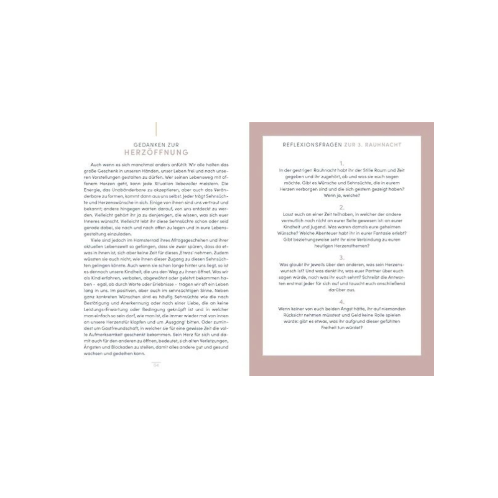 Kurz, kompakt und trotzdem einfühlsam und mit Tiefgang leitet Bestsellerautorin Tanja Köhler durch alle zwölf Tage und Themenbereiche der Rauhnächte. Jede Rauhnacht steht unter einem bestimmten Motto und beginnt mit einer inspirierenden Geschichte. Passend zum Tagesmotto ist das Rauhnachtsritual gestaltet, aber auch weitere Ideen des gemeinsamen Innehaltens und Klarheit-Schaffens werden vorgestellt. Außerdem ermöglichen Übungen und Gespräche mit dem Partner oder der Partnerin, einen Blick zurückzuwerfen sowie Klarheit, Kraft und Inspiration für das kommende Jahr zu erlangen. Die Reflexionsfragen und Übungen bewirken aber nicht nur eine intensive Zeit zu zweit, sondern berücksichtigen auch individuelle Wünsche und Bedürfnisse.
