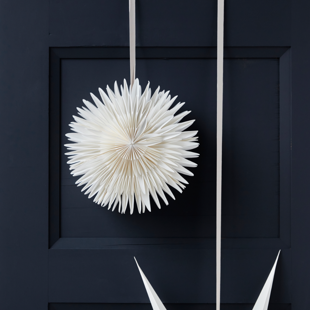 Der handgefertigte Stern besteht aus mehreren Lagen hochwertigen Papiers, die ihm seine charakteristische Tiefe und Struktur verleihen. In zartem Weiß gehalten, wird er zum stillen Blickfang im Fenster, über dem Esstisch oder frei im Raum schwebend.