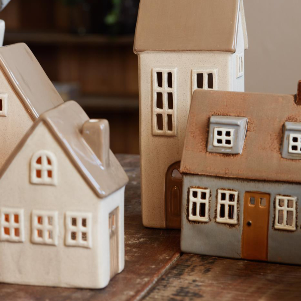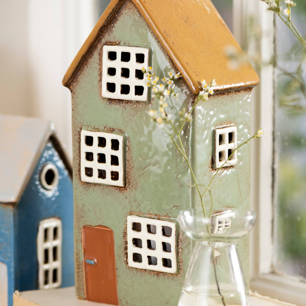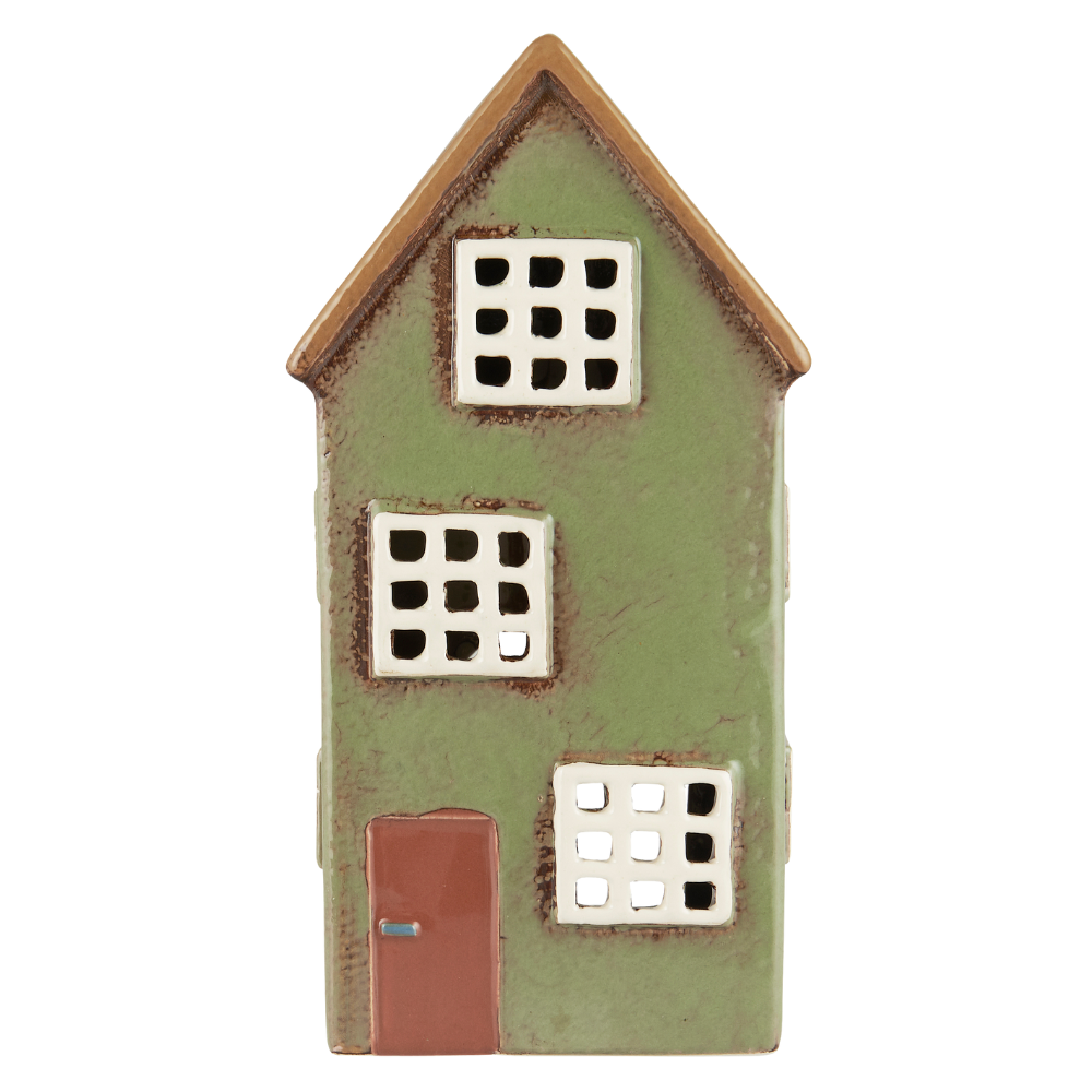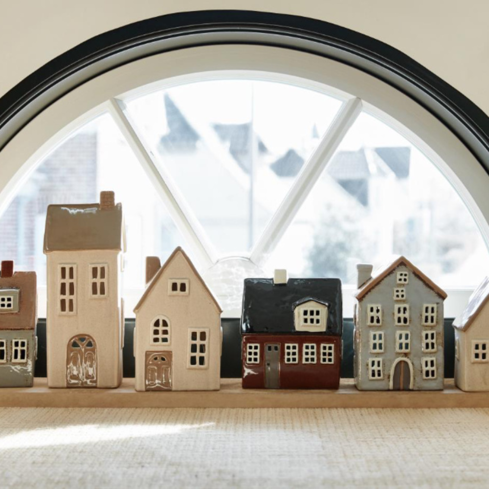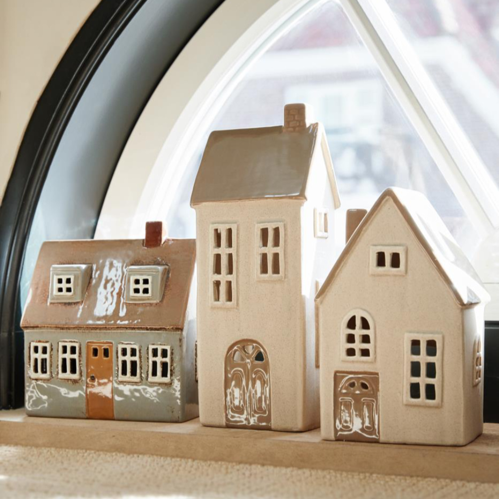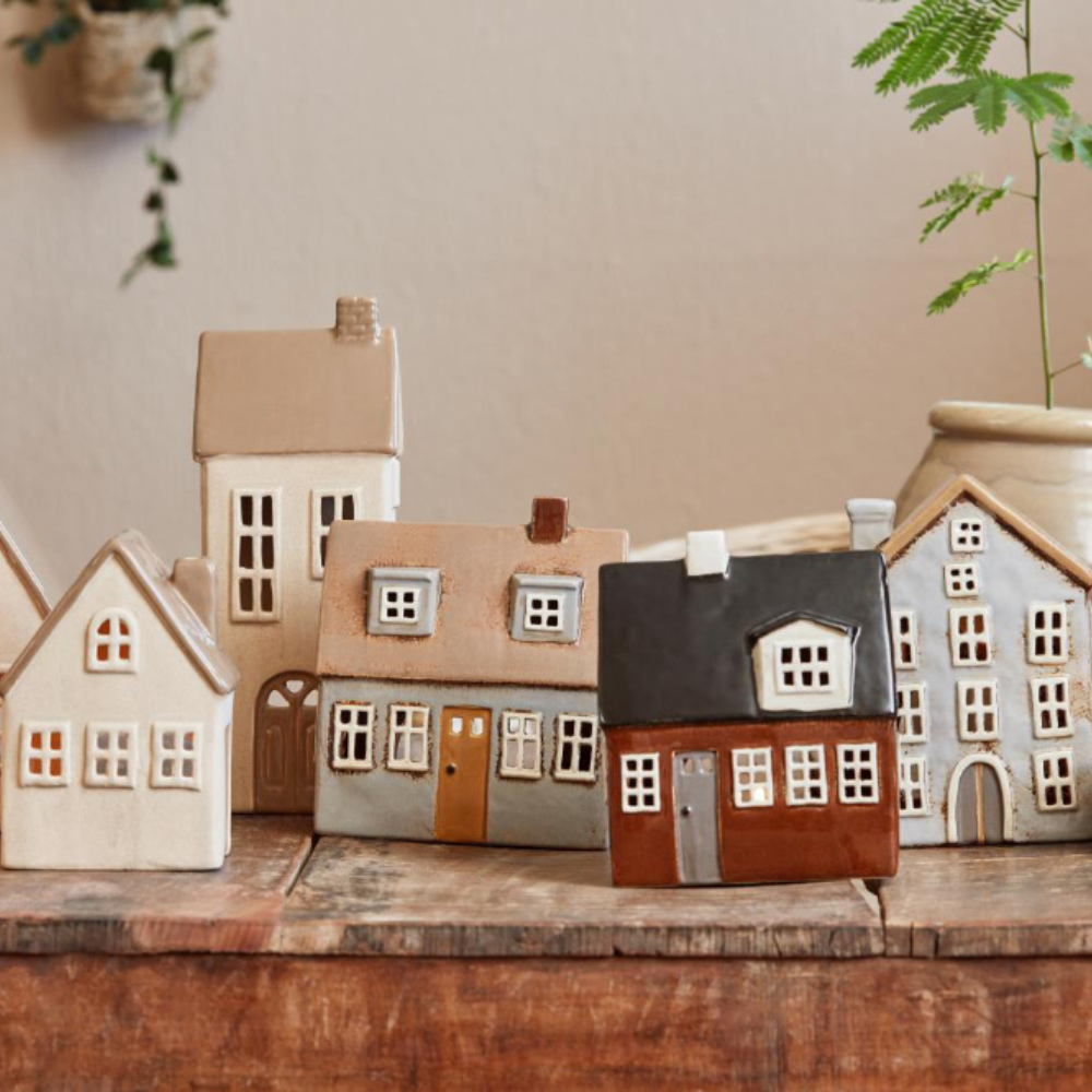 Jedes Haus wird aus glasiertem Steingut von Hand gefertigt – mit kleinen Unebenheiten, die seinen einzigartigen Charakter unterstreichen. Ob als leuchtender Akzent auf dem Sideboard, in einem Arrangement auf der Fensterbank oder als kleine Lichterstadt im Regal: Dieses Häuschen schenkt deinem Alltag eine Prise Skandinavien, einen Hauch von Nostalgie – und ein Gefühl von Zuhause.