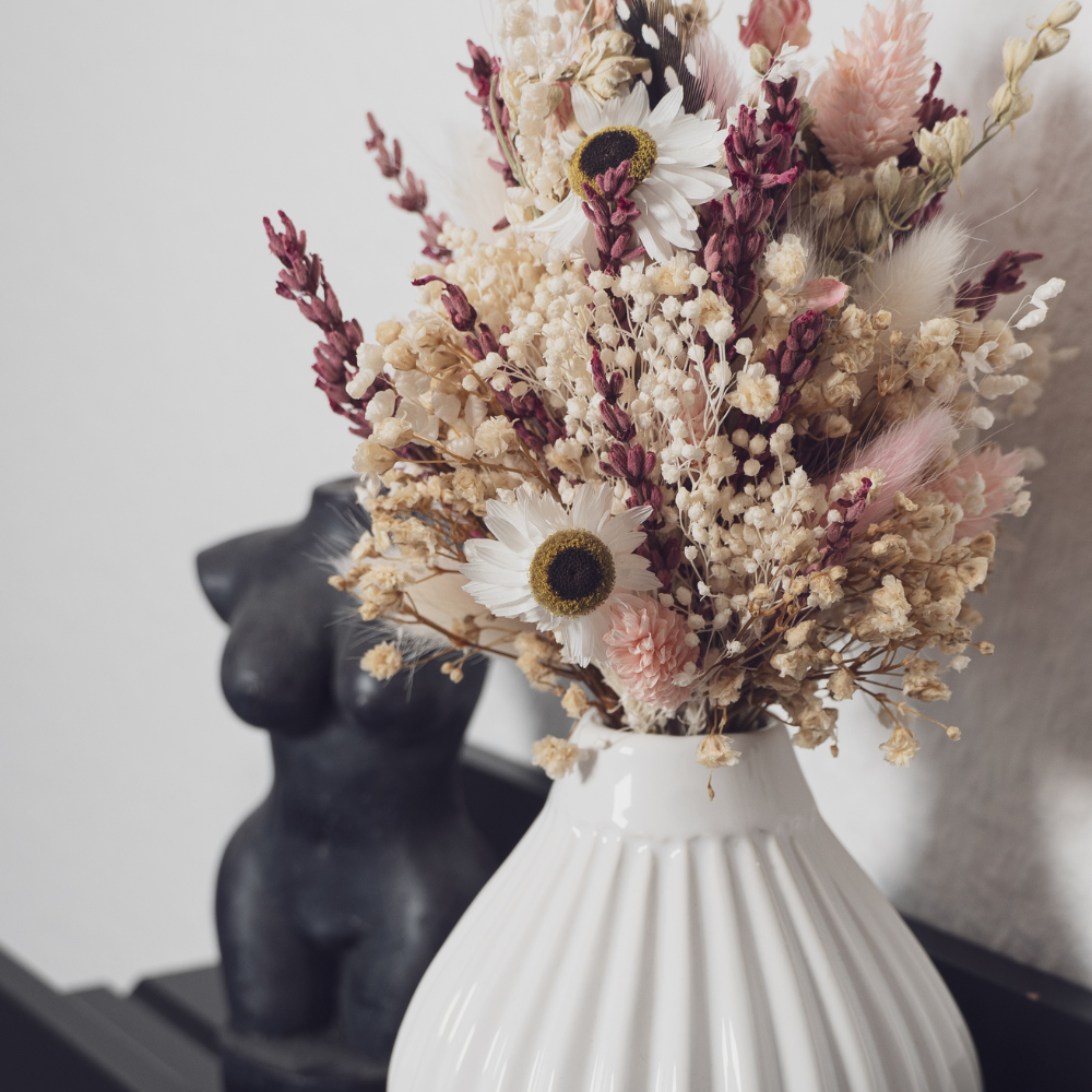 Trockenblumenprodukte bieten den Vorteil, Deine Lieblingsblumen unabhängig von der Saison zu genießen, da sie über mehrere Monate ihre Schönheit und Form bewahren, Zeit und Geld im Vergleich zu Frischblumen sparen und pflegeleicht sind, da kein Gießen erforderlich ist.