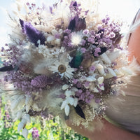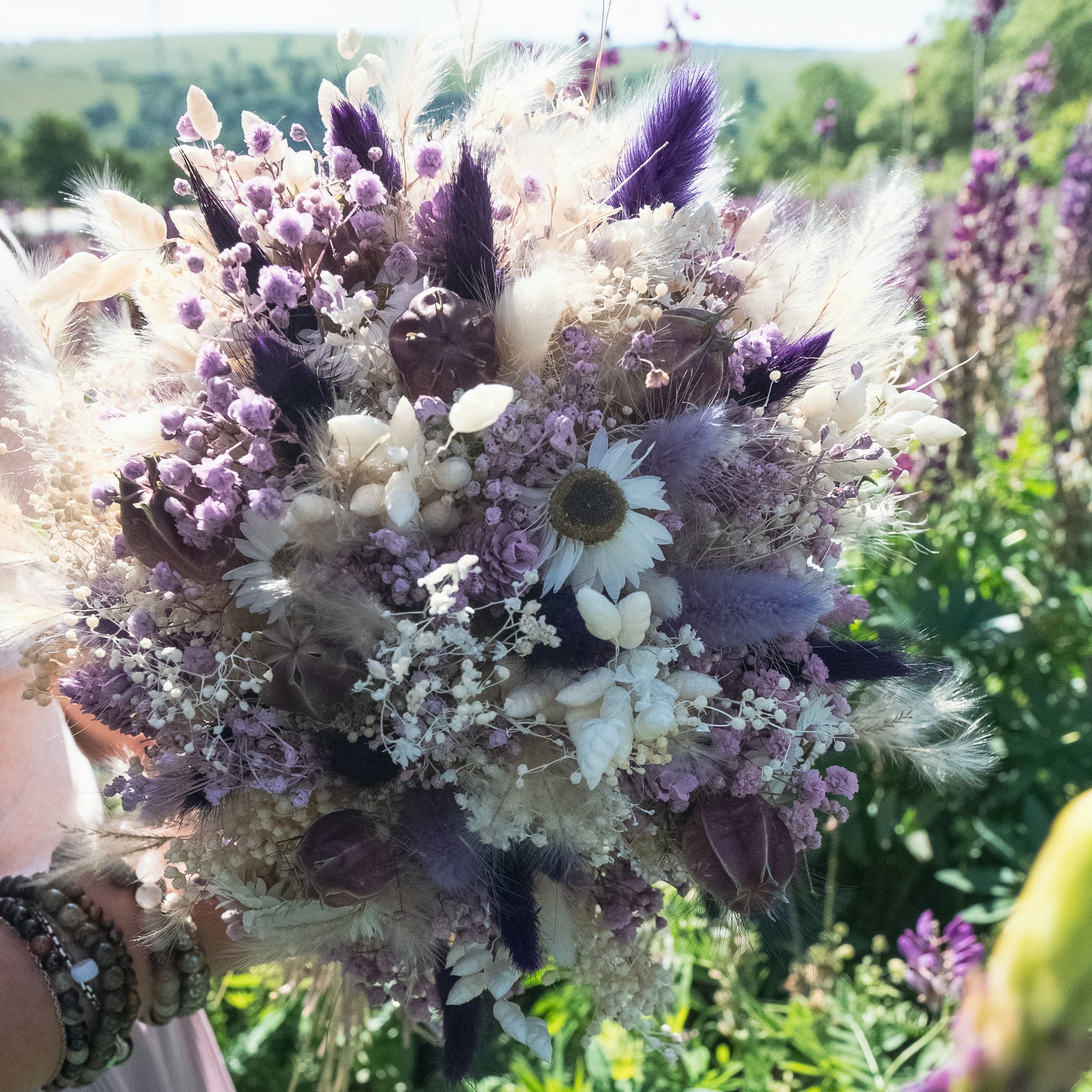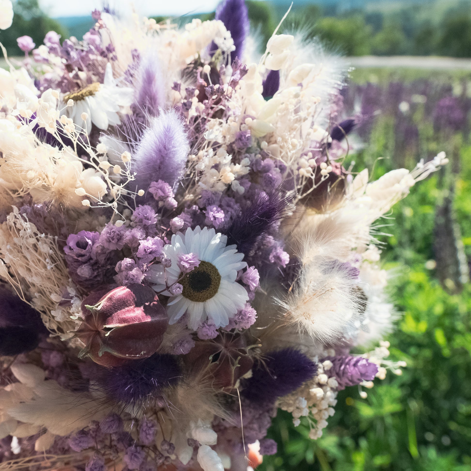 Nigella lila, Briza maxima weiß, Acroclinium weiß, Schleierkraut mini weiß & lila, Lagurus milka, dunkellila & weiß, Phalaris lila, Broom Bloom lila & weiß, Pampas Pluminha
