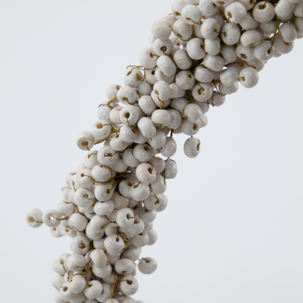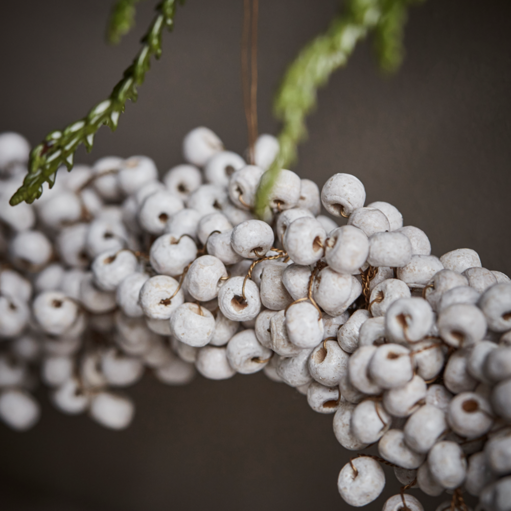 Schlicht, natürlich, zeitlos schön – der Winter | Holzperlenkranz Weiß bringt nordische Wärme in die Winterzeit. Handgefertigt aus feinem Mangoholz und zartem Messingdraht, vereint er Natürlichkeit mit eleganter Zurückhaltung.