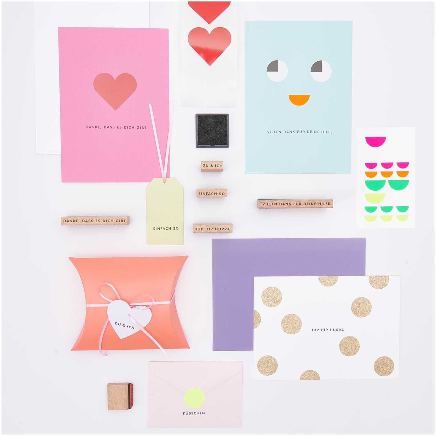 Das Stempelset im XL-Format enthält Textstempel für verschiedenste Anlässe sowie ein schwarzes Tuschestempelkissen. Die Holzstempel eignen sich zum Verzieren von Grußkarten, Geschenkanhängern und vielem mehr. Die Motive der Stempel können eigenständig eine Karte zieren oder werden durch Tapes, Handlettering oder weitere Farbgestaltung ergänzt.