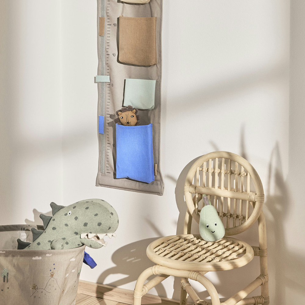 Ihr zartes Dusty Green bringt Ruhe und Natürlichkeit ins Kinderzimmer, während die liebevoll bestickten Details der Birne einen Hauch von Poesie verleihen. Im Inneren sorgt eine Füllung aus recyceltem Polyester für Nachhaltigkeit, und das sanfte Rasselgeräusch weckt spielerisch Neugier und fördert die Sinne, ohne jemals zu laut zu sein.