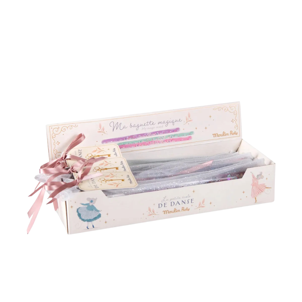 Glitzer, Magie & Farbenfreude. Funkelnde Träume zum Mitnehmen: Der ZAUBERSTAB von Moulin Roty verzaubert mit einer bunten Mischung aus Rosa, Lila und Türkis. Jeder Stab ist mit schimmernden Pailletten gefüllt und kommt in einem zarten Tüllbeutel mit Satinband – perfekt zum Verschenken, Staunen und Spielen.